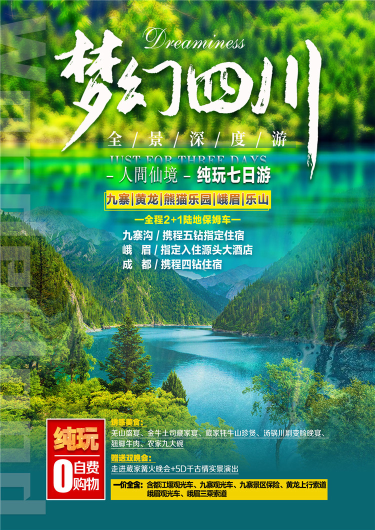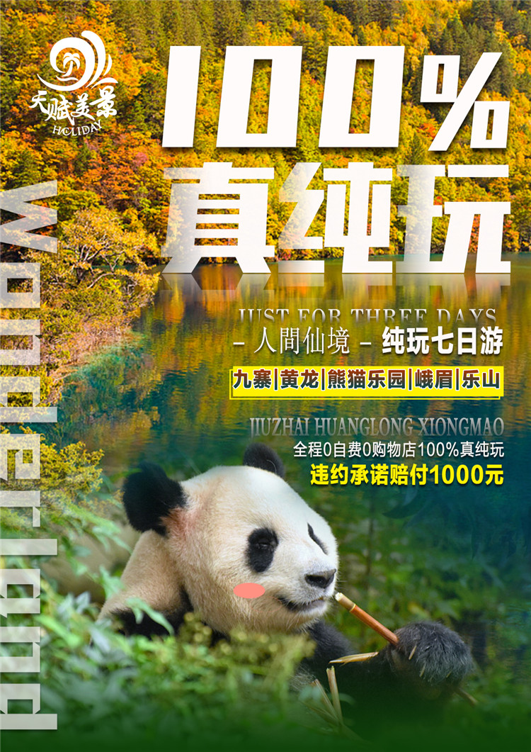 夢幻全景=九寨溝、黃龍、熊貓基地、樂啥大佛、二進峨眉七日游